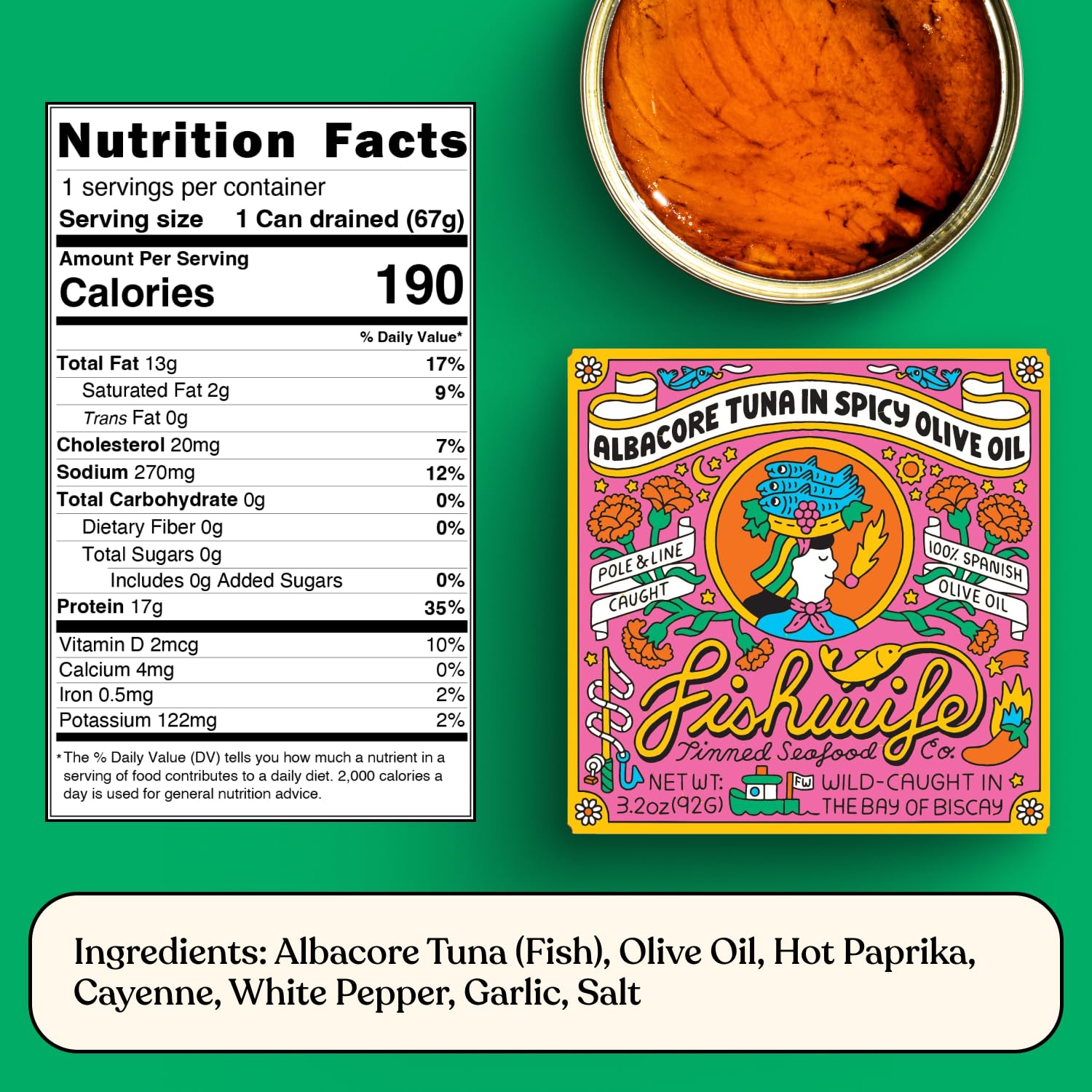 Ingredients: Albacore Tuna (Fish), Olive Oil, Hot Paprika, Cayenne, White Pepper, Garlic, Salt.
