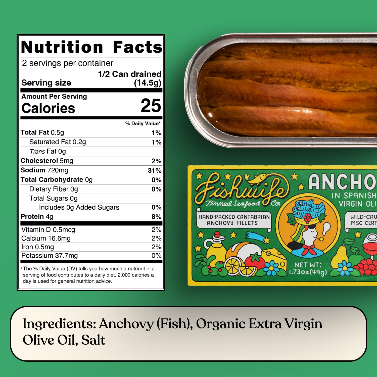 Anchovies (fish), organic extra virgin olive oil, salt.